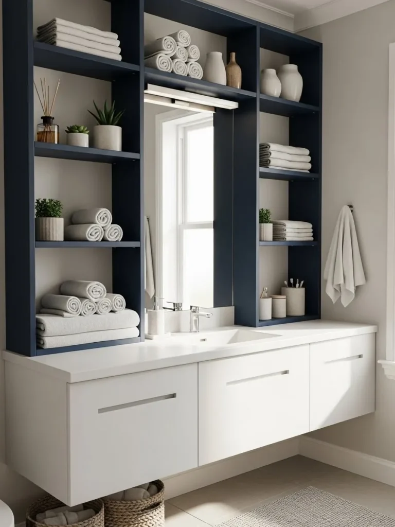 Incorporating navy shelves or built-in niches adds functionality without overwhelming the space. Shelving can hold toiletries, decorative items, or towels, all while reinforcing the color theme. Open shelves painted in navy look particularly striking against white or light walls, creating a layered, textured effect.