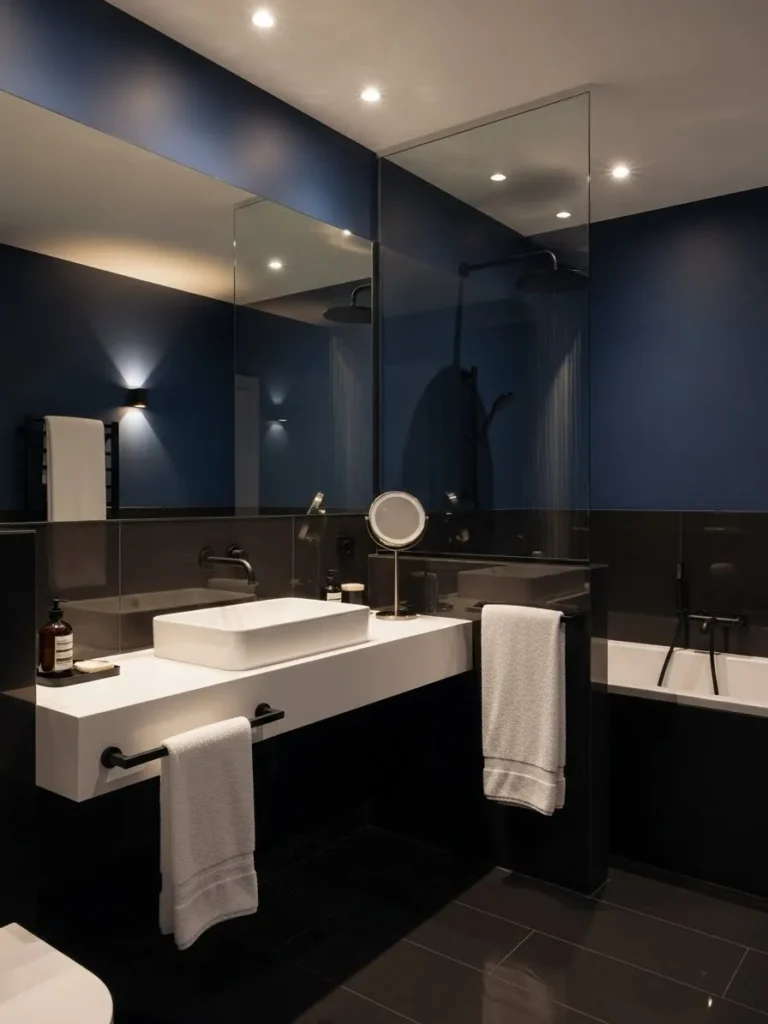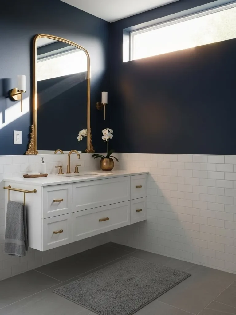 Painting your bathroom walls navy blue is one of the simplest yet most impactful ways to create drama. This color works exceptionally well in medium to large bathrooms where natural light can balance the depth of the hue. Pairing navy walls with white or light gray tiles creates a clean, crisp contrast that prevents the room from feeling too dark. Consider adding gold or brushed brass fixtures—they stand out beautifully against navy, elevating the entire space.