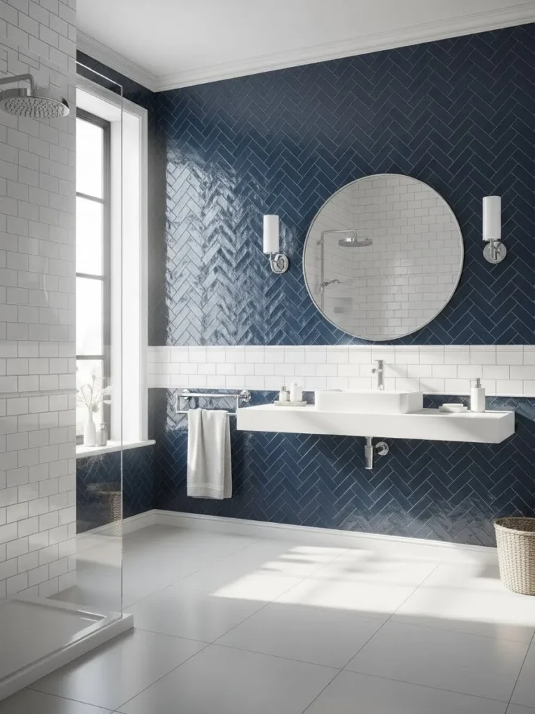 Tiles are a powerful way to introduce navy blue without committing to painting walls or cabinets. Using navy tiles in patterns, like herringbone or chevron, adds texture and personality. Combining navy with white tiles creates a timeless look that balances boldness with brightness. For instance, navy floor tiles can anchor the room while white subway tiles on the walls keep the space feeling open.