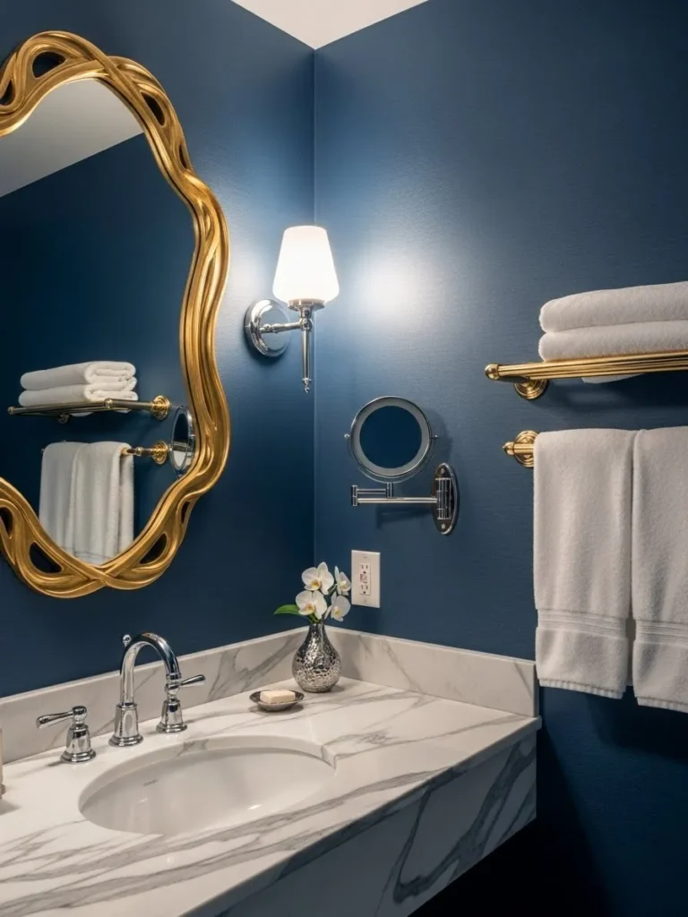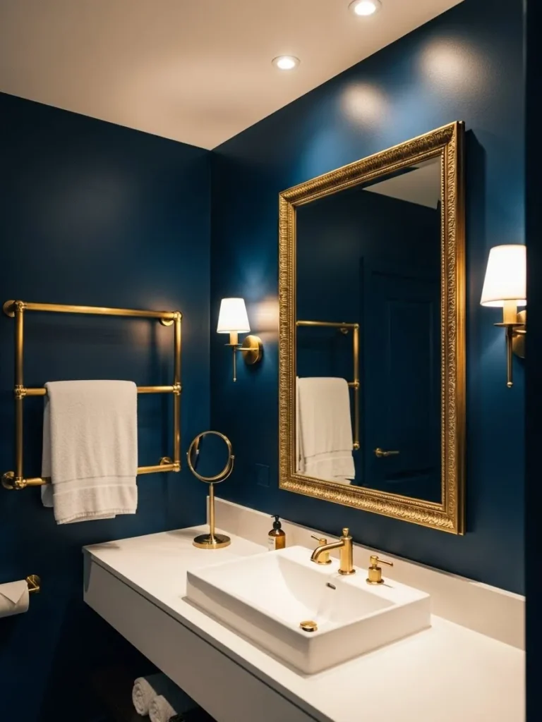 Navy blue pairs beautifully with gold, creating a rich, opulent atmosphere. Gold fixtures, towel racks, and mirrors contrast with navy surfaces, giving the bathroom a high-end boutique feel. Even small touches, like gold knobs or soap dispensers, can make a navy bathroom feel intentional and luxurious without overwhelming the space.