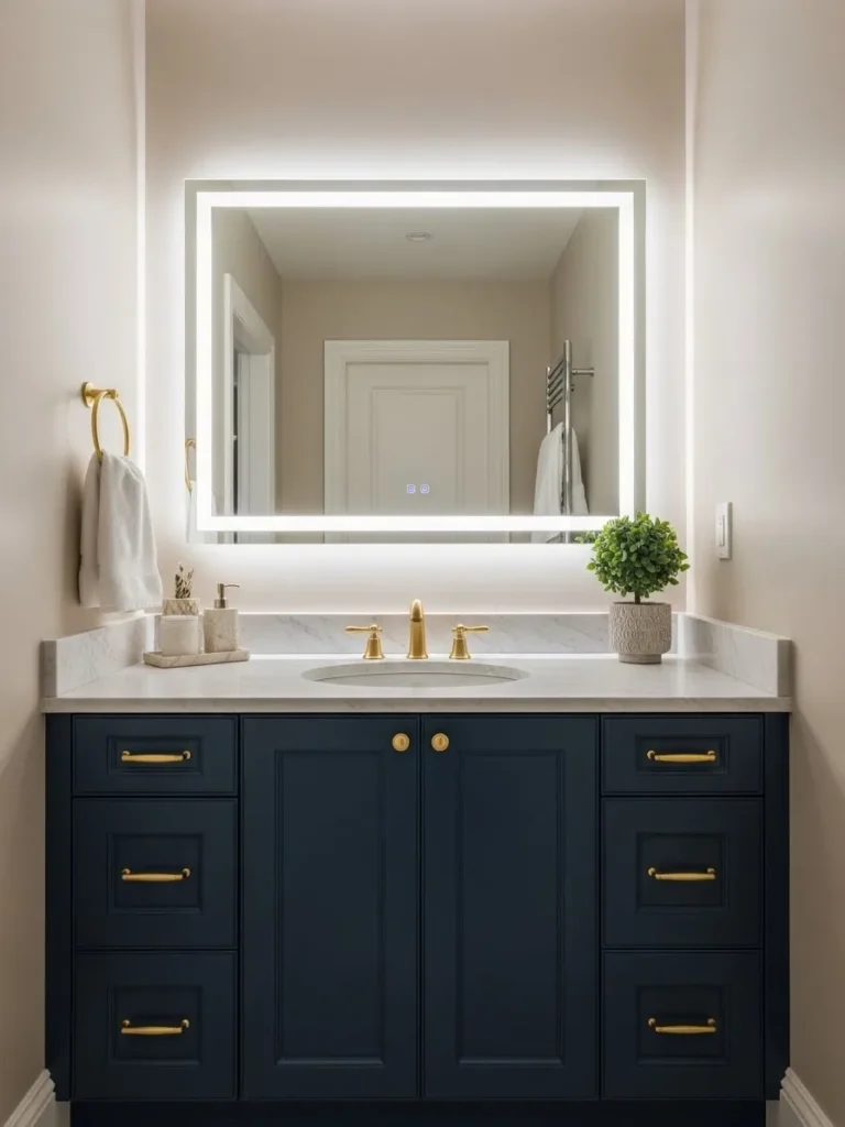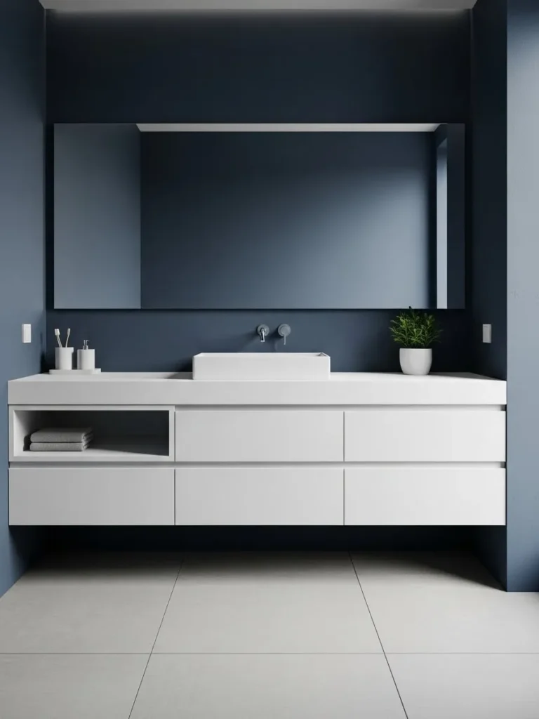 A navy blue vanity instantly draws attention and serves as the room’s centerpiece. This works well in bathrooms with neutral walls, where the vanity acts as a statement piece. Consider floating vanities painted in navy to enhance the sense of space. Pairing the vanity with a statement mirror or elegant lighting completes the luxurious feel.