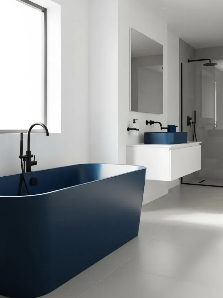 A freestanding navy blue bathtub can transform a bathroom into a dramatic retreat. It works especially well in spaces with ample natural light or large windows. Complement the bathtub with light-colored tiles or natural wood flooring to balance the intensity of the navy and create a spa-like atmosphere.