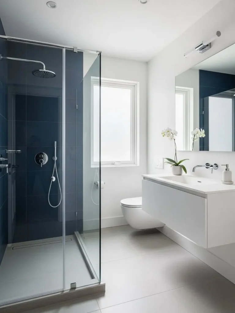 Glass elements, such as shower doors, shelving, or partitions, pair beautifully with navy blue. Glass prevents the space from feeling closed in while allowing the richness of navy to shine. Frosted or textured glass adds privacy without sacrificing light, creating a bright yet dramatic bathroom environment.