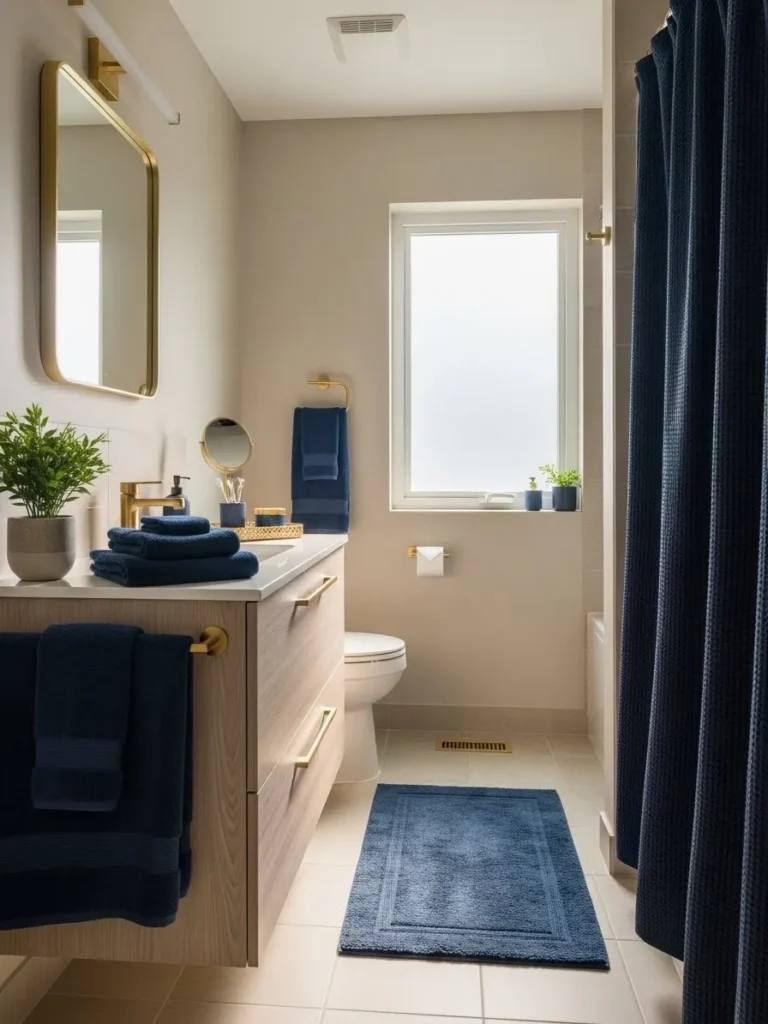 Even if painting walls or cabinets feels too bold, navy accessories can subtly introduce the color. Towels, rugs, shower curtains, and storage baskets in navy provide sophistication without overwhelming the space. This approach works well in small bathrooms where large color blocks might make the room feel cramped.