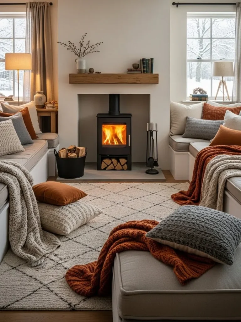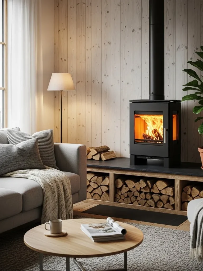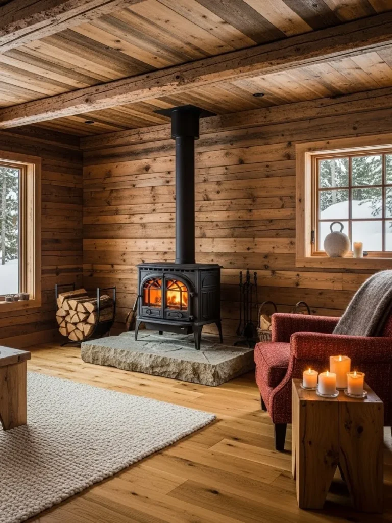 When installed correctly, a central stove becomes a gathering point. People instinctively arrange seating around it. The fire is visible from every direction, and the warmth feels more balanced. This idea requires thoughtful planning and professional installation, but the result is unmatched comfort.