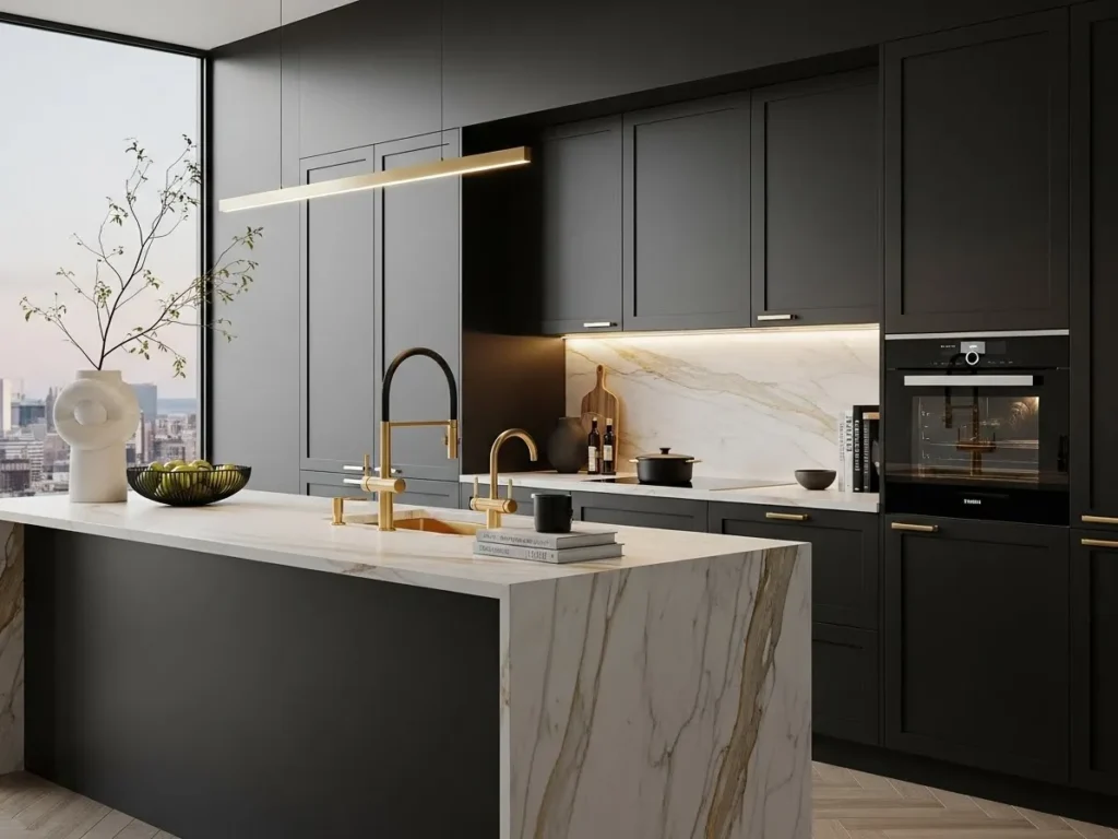 The combination of matte black and soft gold accents is a bold yet refined trend shaping 2026 minimalist kitchens. Black offers a strong, modern foundation, while gold adds warmth and luxury without overwhelming the space. When used thoughtfully—on cabinet hardware, lighting, or faucets—these tones create a striking contrast that feels high-end and sophisticated. This pairing enhances neutral kitchens by injecting a touch of dramatic elegance.