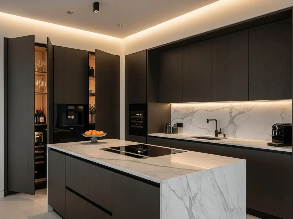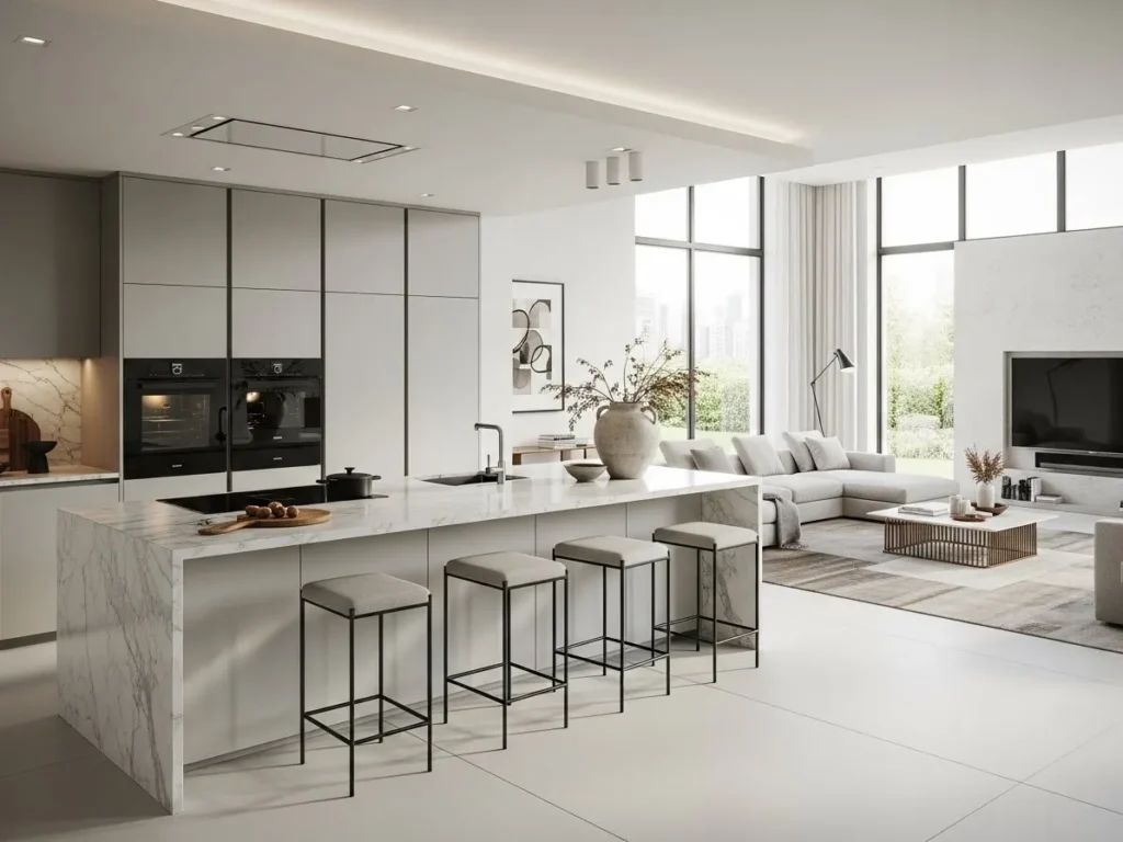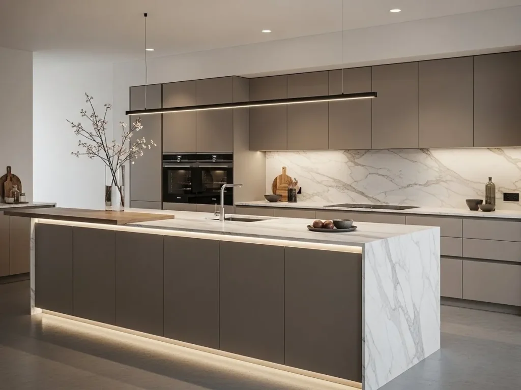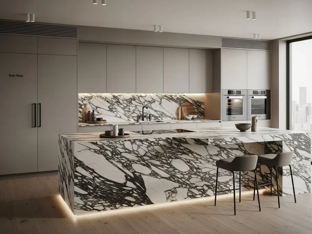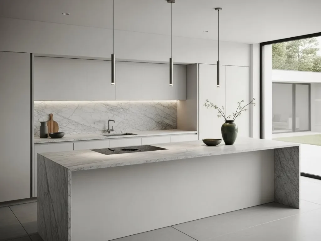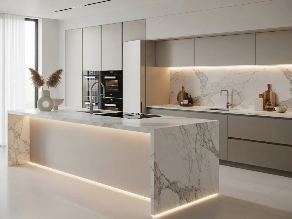 Despite their artistry, statement islands remain highly functional with integrated storage, seating, and prep surfaces. Soft lighting enhances the stone’s natural movement, creating a warm, dynamic ambience. When paired with handleless cabinets and seamless appliances, the island becomes the centerpiece of a truly luxurious minimalist kitchen. This trend is ideal for those wanting a show-stopping feature that elevates the entire home’s design.