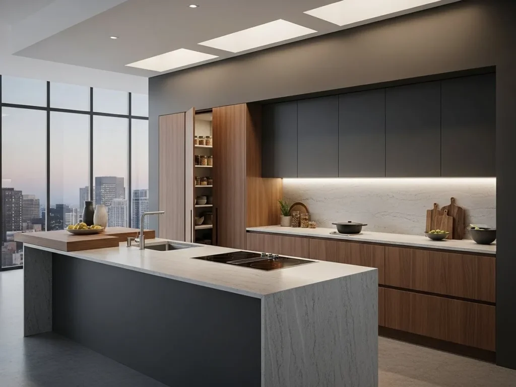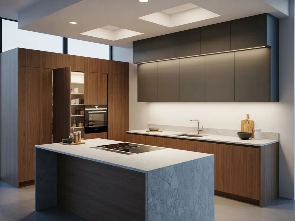 Handleless matte cabinets offer a smooth, uninterrupted look that defines minimalist luxury in 2026. These cabinets open with touch systems or hidden grooves, eliminating visual clutter and creating a clean, architectural aesthetic. Matte finishes add depth and warmth without reflecting light harshly, making the kitchen feel serene and modern. This concept appeals to those who appreciate simplicity and want cabinetry that blends beautifully into the kitchen while maintaining top-tier functionality.