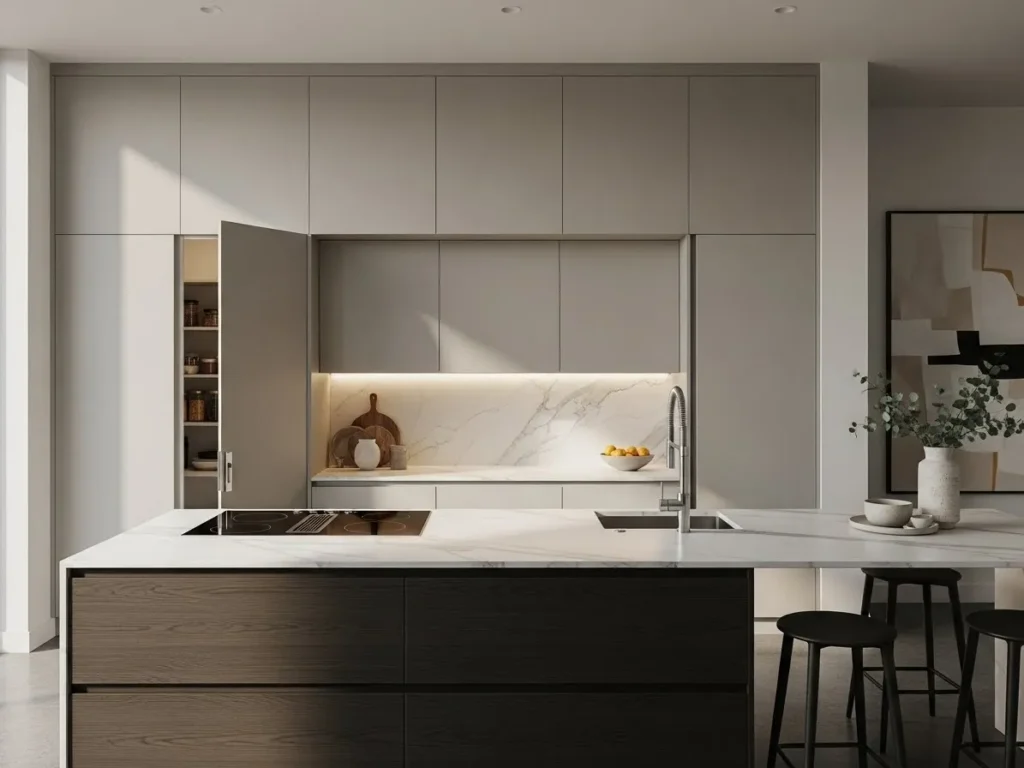 Inside the hidden pantry, smart storage features like adjustable shelves, pull-out racks, and built-in lighting create an organized, interactive experience. The concealed space allows you to keep appliances, snacks, and groceries out of sight while maintaining easy access. This approach not only enhances visual harmony but also improves workflow, making meal prep more efficient. Hidden pantry walls embody the true essence of minimalist luxury—beautiful on the outside, smart on the inside.