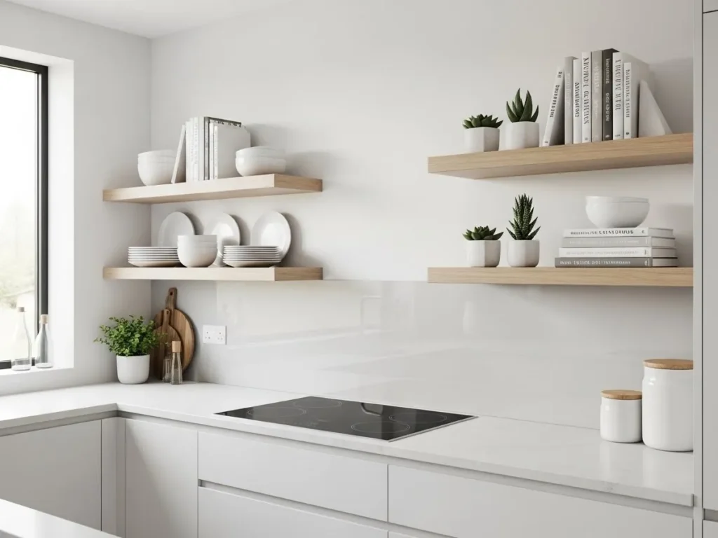 To avoid visual clutter, many designers recommend styling shelves with a minimal number of items in cohesive colors and textures. Light wood or matte finishes blend beautifully with stone backsplashes and slim countertops. LED lighting beneath the shelves adds a soft glow that elevates the overall look. Floating shelves offer a perfect blend of practicality and visual appeal—ideal for homeowners who appreciate minimalism without sacrificing personality.