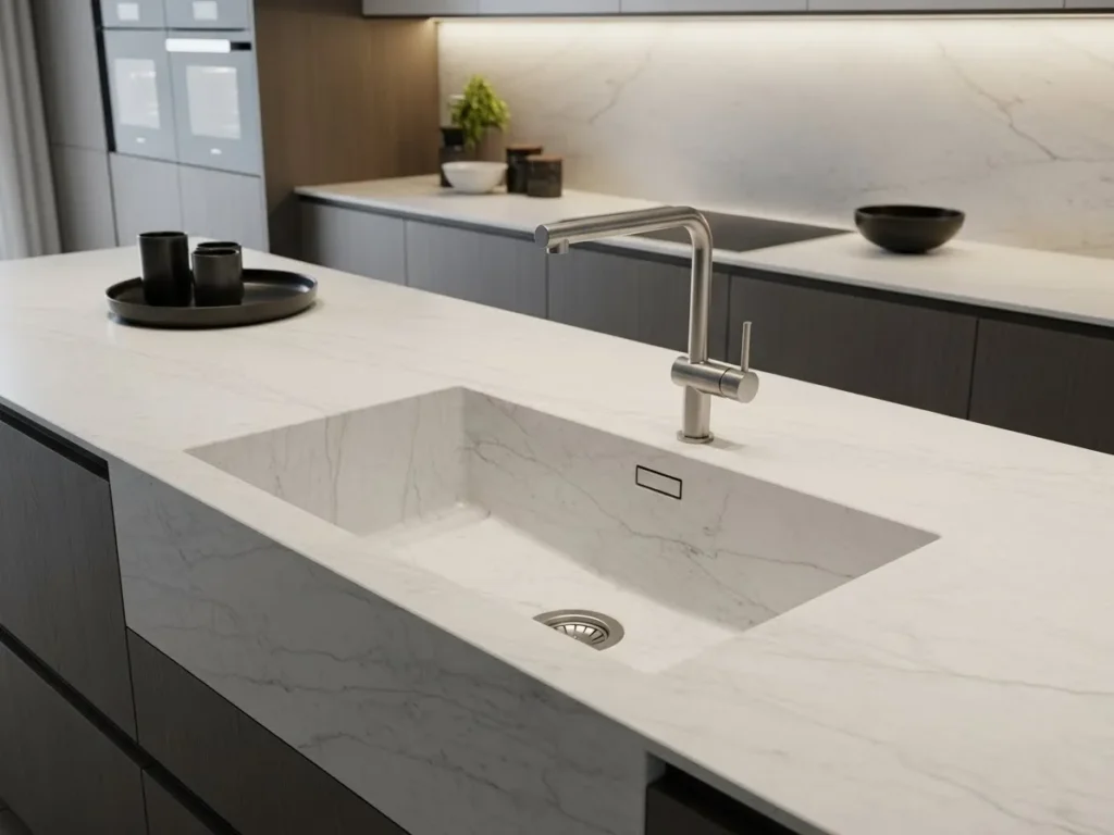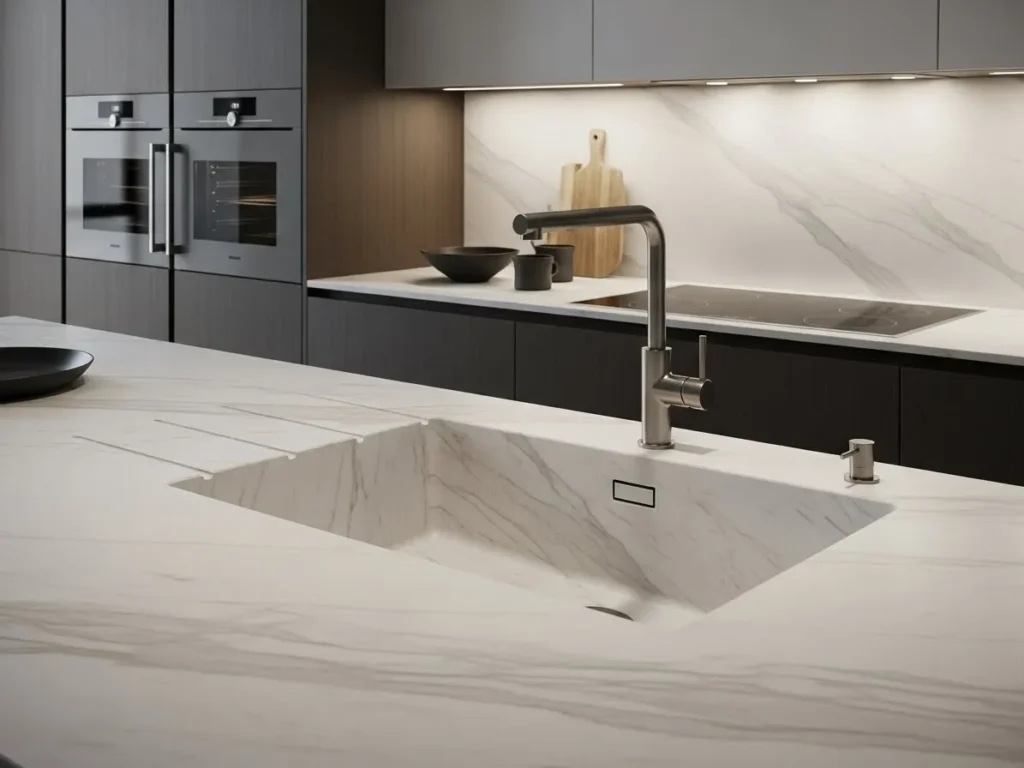 This integrated sink design pairs beautifully with slim countertops, hidden appliances, and matte cabinetry. The clean look elevates the overall kitchen aesthetic while enhancing daily usability. Seamless sinks also allow designers to play with subtle textures and veining that flow naturally across the counter. This trend is ideal for those seeking a kitchen with uninterrupted lines, smooth transitions, and a high-end minimalist appearance.