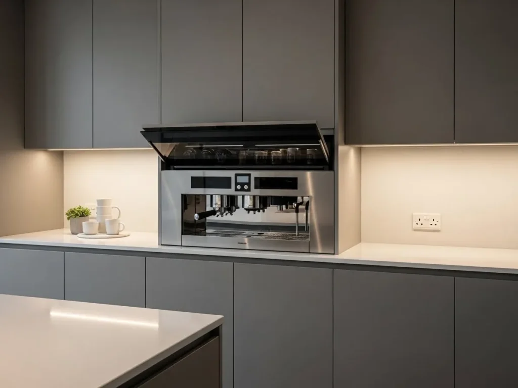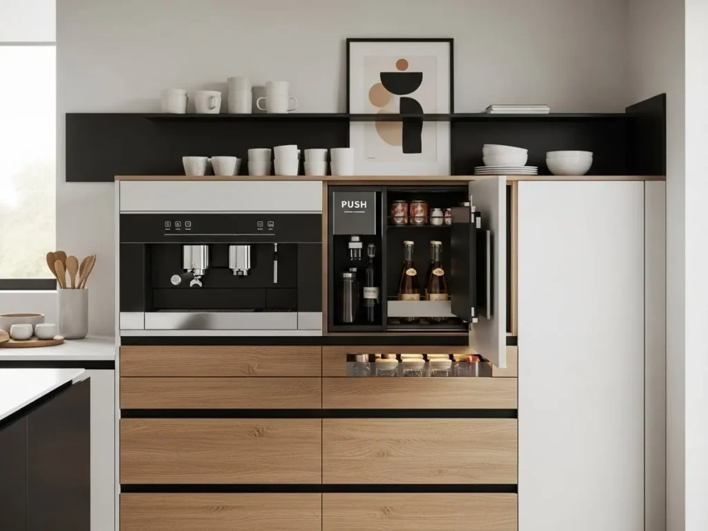 A well-designed coffee station blends harmoniously with surrounding materials, making it feel like a natural extension of the kitchen. Soft lighting enhances the space, creating a cozy morning atmosphere. Some homeowners even incorporate small sinks, micro-fridges, or pull-out trays for a complete beverage experience. This luxurious yet functional feature transforms the kitchen into a stylish and highly personalized space that encourages daily enjoyment and effortless hosting.
