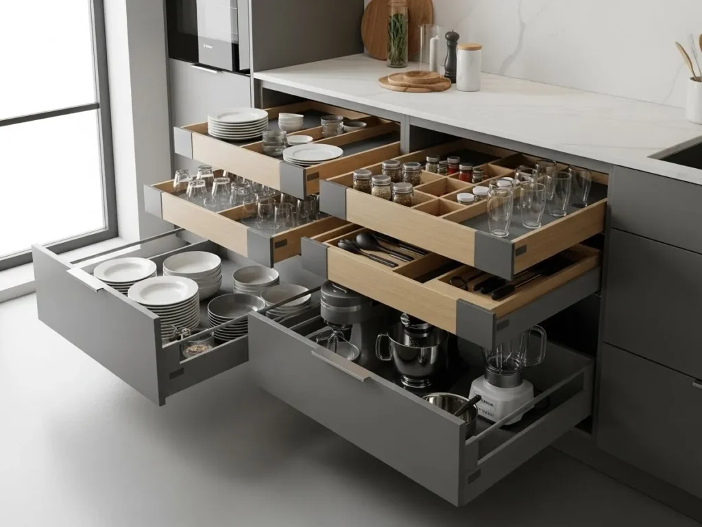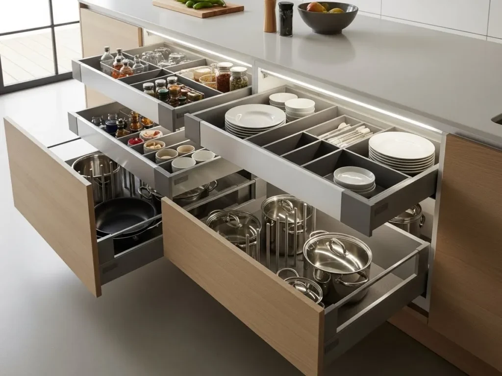 Deep storage drawers are becoming a hero feature of 2026 kitchens, offering practical, organized storage in a minimalist form. These drawers replace traditional lower cabinets, giving homeowners easier access to pots, pans, dishware, and pantry items. Their smooth pull-out design reduces clutter and improves kitchen workflow, helping maintain the clean, uninterrupted lines that define minimalist luxury. Deep drawers are especially useful in large families or high-use kitchens where organization matters.
