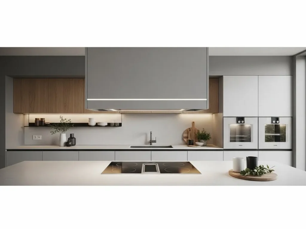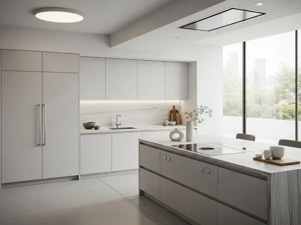 Concealed range hoods are a defining element of 2026 minimalist kitchen design, offering clean lines and a clutter-free cooking area. These hoods are integrated into cabinetry or hidden behind matching panels, blending perfectly with the kitchen’s overall aesthetic. This approach eliminates bulky, protruding shapes and ensures that the focus stays on the kitchen’s sleek architecture. Concealed hoods are especially popular among homeowners who want luxury without compromising visual simplicity.