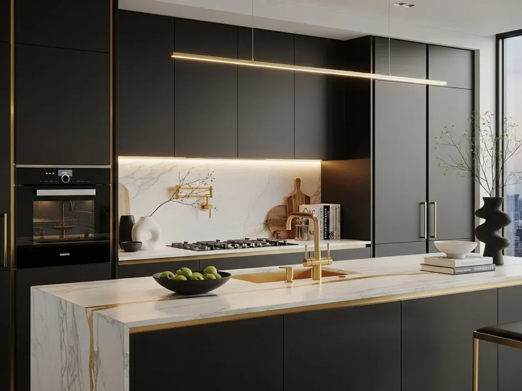 Designers often balance black and gold elements with soft stone surfaces, warm woods, and simple cabinetry to maintain a clean aesthetic. Gold highlights catch the light beautifully, especially when paired with soft LEDs, while black provides structure and depth. This combination brings unique personality into minimalist kitchens, offering the perfect blend of boldness and refinement. It’s a great option for homeowners seeking a modern look with an elevated, luxurious edge.