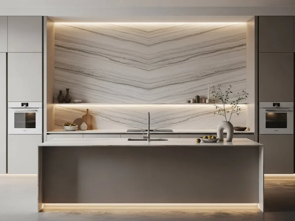 Stone backsplashes work perfectly with matte cabinetry, minimalist fixtures, and integrated appliances. They provide an eye-catching backdrop that balances simplicity with organic charm. The smooth, continuous surface makes cleaning easy and elevates the overall kitchen aesthetic. For anyone seeking a minimalist luxury kitchen that feels timeless and serene, a neutral stone backsplash is one of the most stylish and practical choices for 2026.