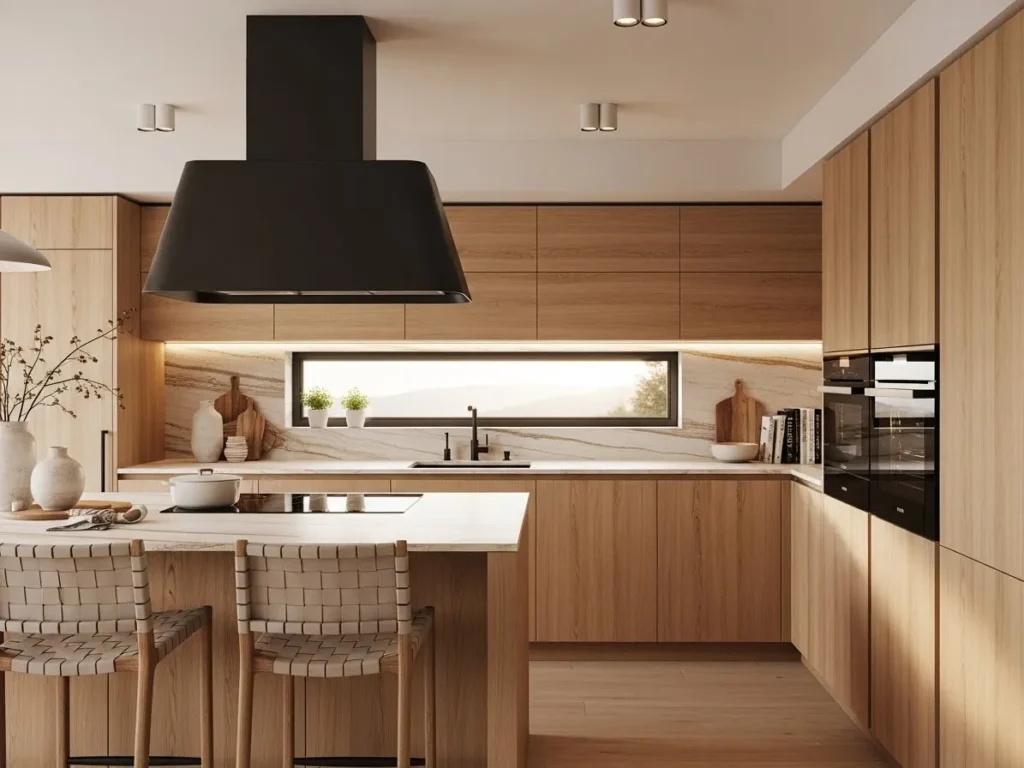 Wood elements work seamlessly with matte black hardware, neutral stone, and warm LED lighting, creating a balanced palette that feels earthy yet elevated. The subtle grain patterns add depth while maintaining simplicity. When paired with minimalist storage and integrated appliances, natural wood becomes the star of the design, offering a pleasing visual break from heavy stones and metals. This trend is perfect for those seeking a kitchen that feels modern, organic, and effortlessly stylish.
