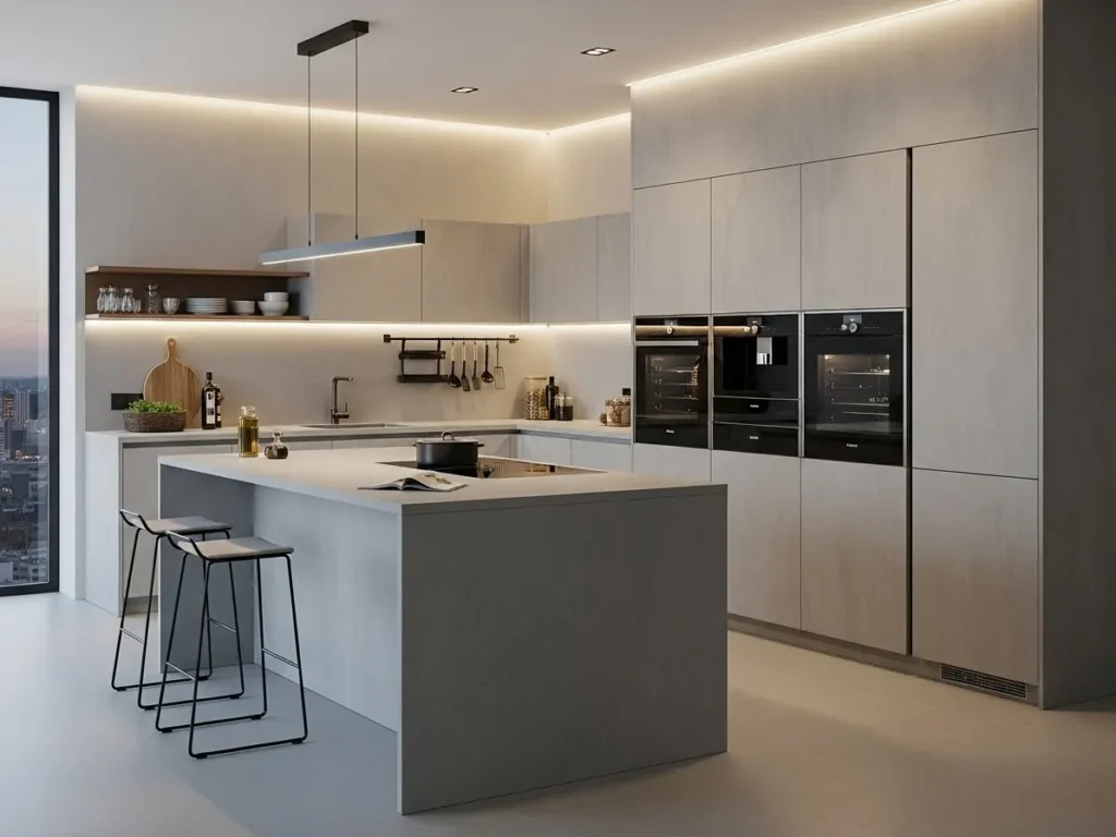 Microcement is one of the most on-trend materials for 2026 minimalist kitchens, offering seamless surfaces that feel both modern and sculptural. Its soft concrete appearance adds texture without overpowering the space, giving the kitchen an elevated industrial-luxury vibe. Microcement can be applied to walls, countertops, and even kitchen islands, creating a unified, uninterrupted look. The material’s natural matte finish works perfectly with neutral palettes and clean lines, enhancing the minimalist aesthetic.