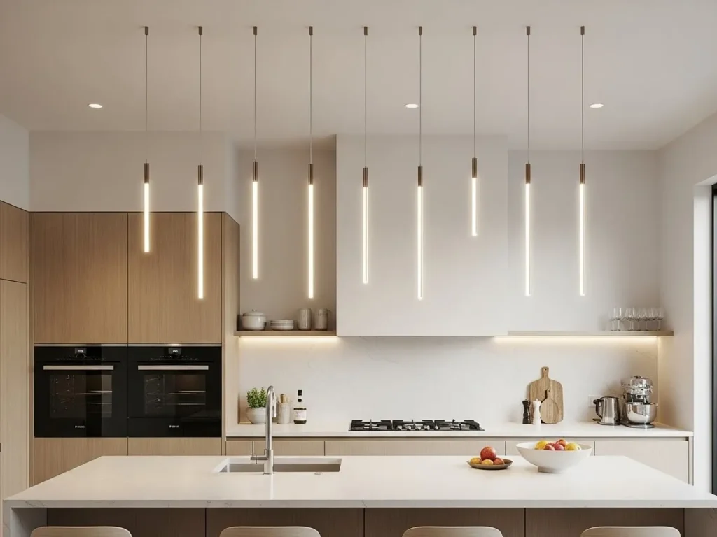 Contemporary pendants pair well with matte cabinetry, neutral stone surfaces, and integrated appliances. Warm LEDs inside the pendants create a soft glow that elevates nighttime ambiance. Many designs feature brushed metal, glass, or minimal geometric shapes that align beautifully with modern luxury themes. Minimalist pendant lighting enhances both atmosphere and style, making it an essential feature for kitchens aiming for clean, intentional elegance.
