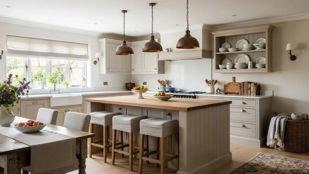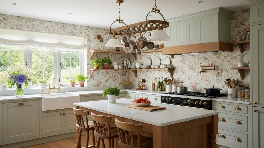 Layering cozy fabrics, such as patterned curtains or cushioned seating, adds warmth without overshadowing the clean lines of modern appliances. Floral décor—kept subtle and tasteful—brings in a refreshing, natural touch. Open shelving with curated vintage pieces enhances the cottage charm while maintaining functionality. The result is a kitchen that feels timeless and heartfelt, offering comfort and beauty in perfect balance.
