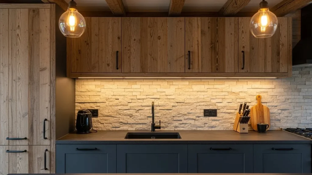 Rustic modern kitchens combine the best of both worlds—raw, natural materials with streamlined contemporary design. Reclaimed wood beams or accents set the tone for a warm, grounded atmosphere, while sleek cabinetry and matte finishes elevate the overall look. Stone backsplashes add texture and visual interest, making the kitchen feel cozy yet sophisticated. This rich blend of organic and modern elements has become a top trend for 2026 homeowners seeking warmth without giving up style.