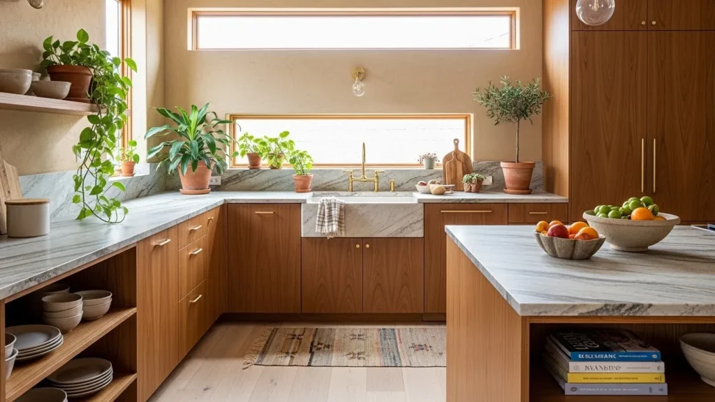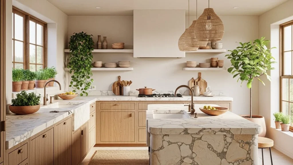Greenery plays an essential role in softening the space and adding life. Indoor herbs, hanging plants, or leafy accents enhance the organic vibe while providing functional beauty. Textured ceramics, woven baskets, and matte finishes add layers of depth without cluttering the space. This approach blends modern simplicity with the warmth of natural materials, creating a kitchen environment that feels soothing, timeless, and incredibly inviting for daily living.