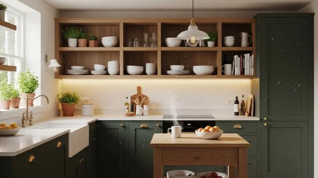 Small kitchens can feel incredibly cozy when designed with warm modern sensibility. In 2026, compact kitchen design emphasizes soft colors, warm textures, and smart use of space. White or light-colored cabinets keep the area open, while wood accents add much-needed warmth. Open shelving reduces visual weight and allows for charming displays of dishes or décor.