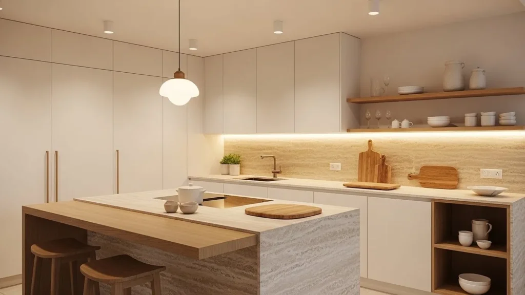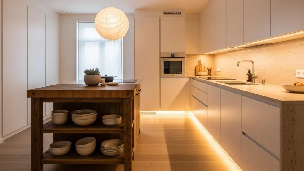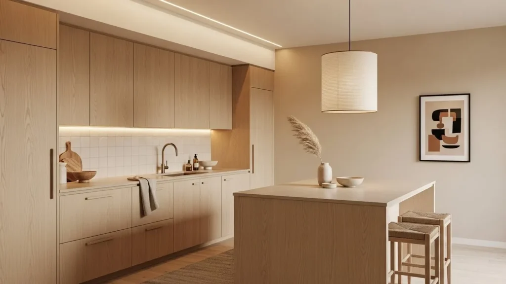 Lighting plays a crucial role in this style, with warm LEDs and pendant lights creating depth and ambiance. Instead of filling the space with décor, the design relies on a few high-quality elements to add personality—such as a handcrafted cutting board or ceramic bowls. The combination of simplicity and warmth turns the kitchen into a calm oasis where cooking and gathering feel effortless and soothing.