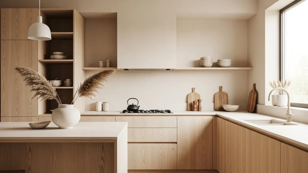 Japandi design continues to dominate 2026 interiors, combining Japanese serenity with Scandinavian warmth. The style focuses on clean lines, light wood cabinetry, and softly muted colors that create a peaceful environment. Beige and off-white tones pair beautifully with natural materials, forming a kitchen that feels balanced and calming. This design suits homeowners who value simplicity and serenity without sacrificing coziness.