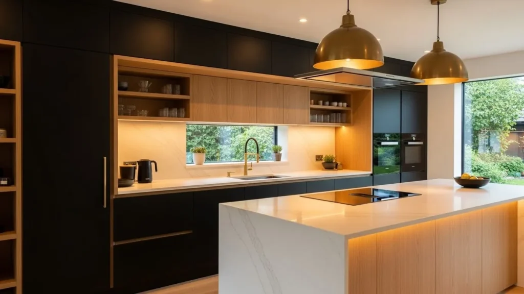Soft black kitchens create a sense of cozy sophistication, offering a bold yet warm design choice for 2026. Matte black cabinetry adds drama without feeling harsh, especially when paired with warm-toned wood and brass accents. The combination creates a stunning contrast that still feels inviting and homey. Soft black is perfect for homeowners seeking a modern aesthetic while maintaining warmth and comfort.