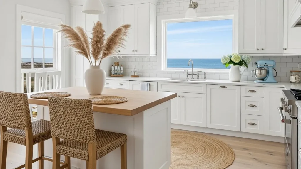 Woven textures—like rattan barstools or seagrass rugs—add warmth and dimension. Coastal décor is kept subtle with shell-toned ceramics, textured throws, and soft art pieces. The result is a kitchen that feels peaceful, bright, and ideal for anyone who loves coastal living or craves that fresh seaside energy in their home.