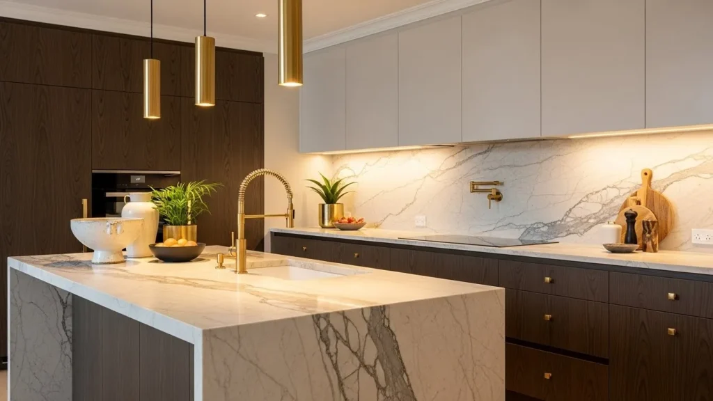 Warm-toned marble brings luxurious coziness to 2026 kitchen designs. Instead of cold gray stone, homeowners are choosing creamy or caramel-veined marble that radiates warmth. Paired with brass fixtures and elegant cabinetry, this design creates a high-end feel that still welcomes everyday use. The natural patterns in the marble add richness and visual comfort.