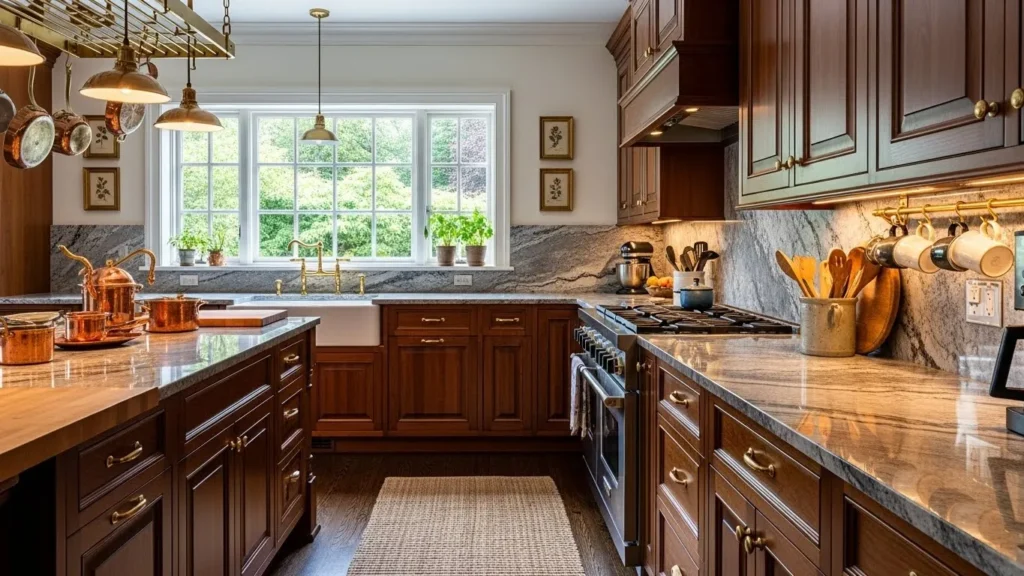 To balance the rich tones, light stone counters and brass hardware introduce brightness and refinement. Decorative touches like greenery or textured ceramics soften the bold palette. This cozy kitchen design blends tradition and modernity beautifully, creating a warm, inviting cooking environment.