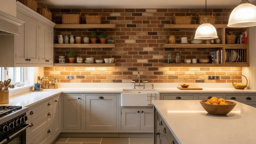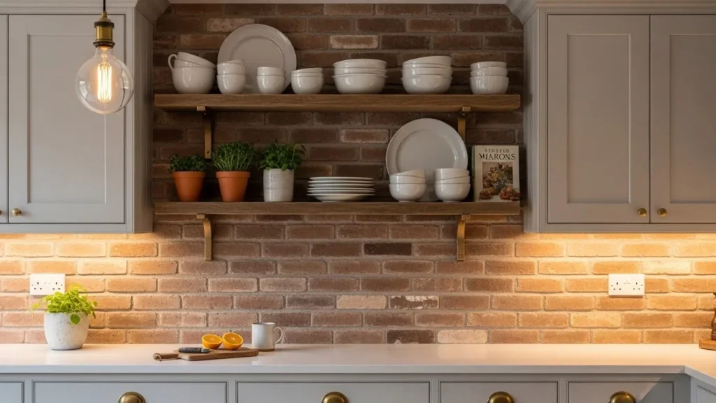 Wood shelving and soft lighting enhance the warm tones, while simple décor maintains balance. Whether using real brick or high-quality brick tile, the effect is the same: a kitchen that blends authenticity with contemporary comfort. This design is especially appealing for those who love rustic elements but want a fresh, modern execution.
