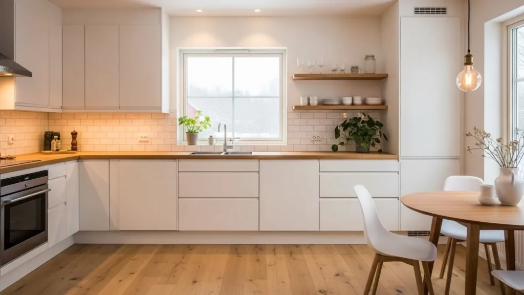 Subtle décor pieces like ceramics, linen textiles, or small plants add personality without clutter. Warm pendants and under-cabinet lighting enhance the inviting atmosphere. This Scandinavian kitchen design is perfect for those who want a cozy, clean, and stylish environment that feels naturally calming.