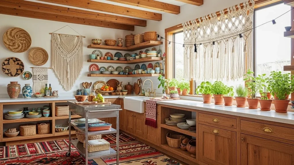 Boho kitchens offer a cozy, expressive aesthetic that feels personal and unique. Warm wood tones help ground the space, while colorful textiles bring vibrancy and warmth. Open shelving adds visual interest, allowing curated collections of ceramics or glassware to shine. This eclectic style encourages creativity and individuality, making the kitchen feel lively and inviting.