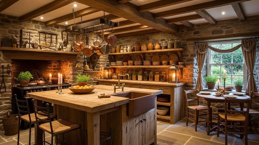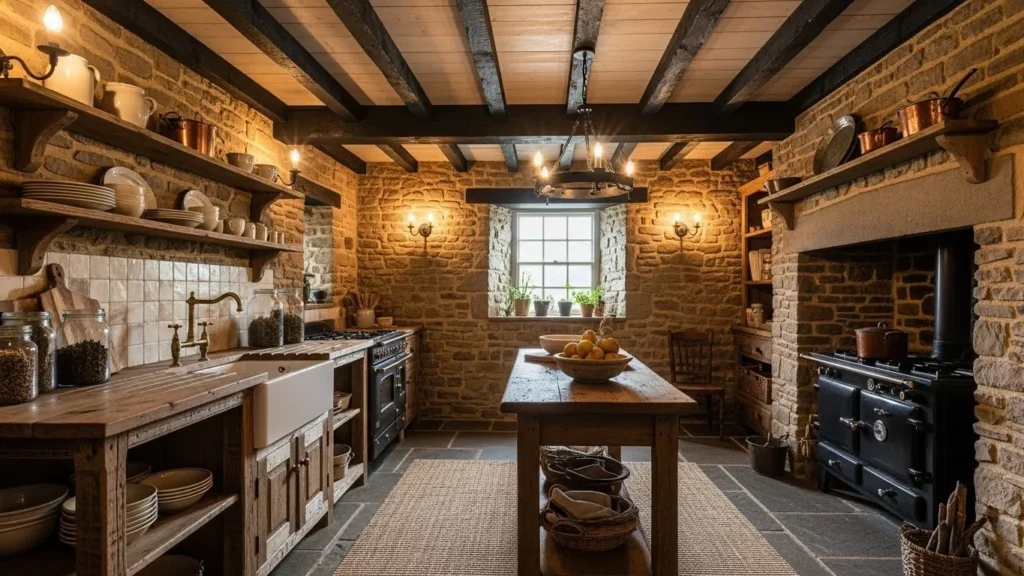 Stone cottage kitchens bring storybook coziness into modern homes. Warm stone walls or stone accents create a natural, textured backdrop that feels earthy and inviting. Combined with wood beams and soft lighting, the kitchen becomes a charming retreat reminiscent of countryside living. This 2026 trend blends rustic charm with updated modern functionality.