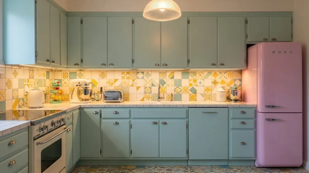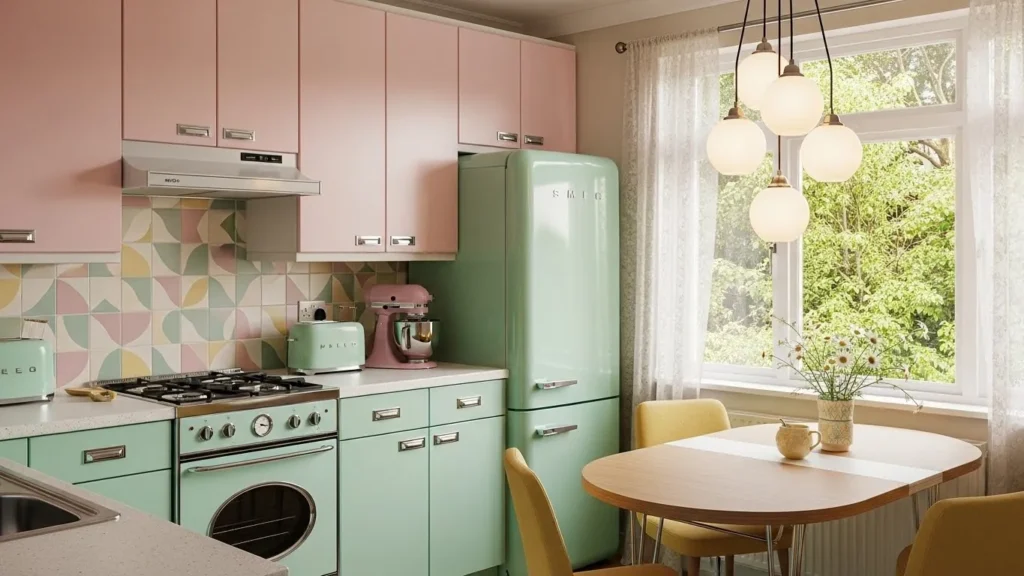 Retro-inspired kitchens are having a major moment in 2026, especially when designed with a cozy modern twist. Soft pastel cabinets bring nostalgic charm, while updated vintage-style appliances add character. Warm lighting helps balance the playful colors, making the kitchen feel joyful yet comforting. This design is perfect for homeowners who appreciate retro aesthetics but want a functional, modern space.