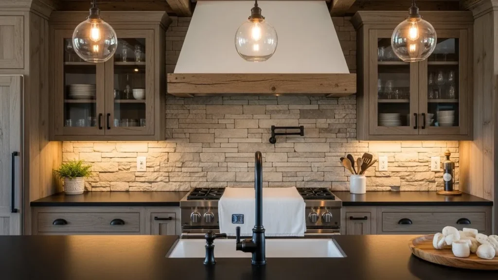 Soft lighting plays an essential role in enhancing the rustic vibe, casting a warm glow over textured surfaces. Matte black hardware adds a modern touch that contrasts beautifully with the natural wood grains and rugged stone. This style works particularly well in open-concept homes, where the kitchen becomes the heart of the living space. Its blend of comfort and modern utility creates a kitchen that’s functional, inviting, and visually captivating.
