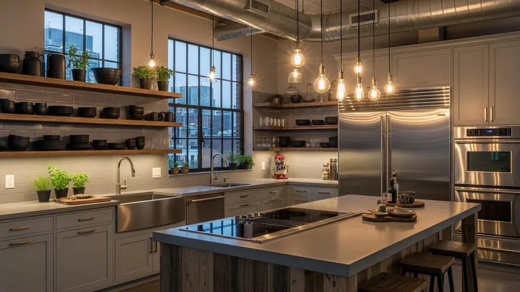 Soft industrial kitchens bring together the rugged appeal of metal elements with the warmth of modern comfort, creating a cozy yet stylish environment. In 2026, this style leans toward softer grays, matte metals, and warm wood features to avoid feeling overly harsh. Open shelving with neatly arranged ceramics keeps the space visually interesting, while warm-toned lighting helps balance the industrial aesthetic. This combination creates a kitchen that feels urban, modern, and unexpectedly inviting.