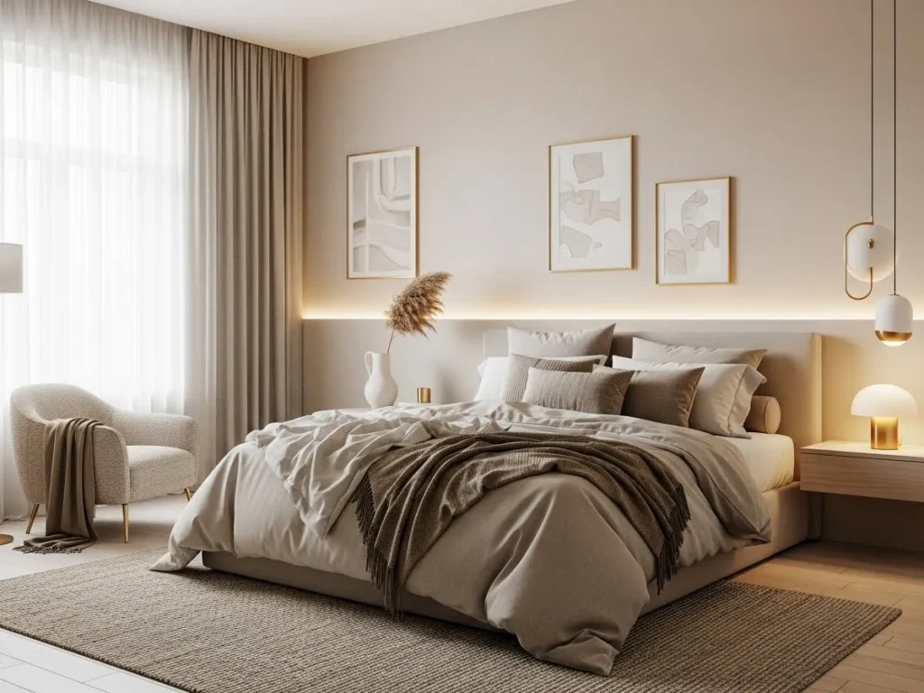 This trend often incorporates sleek built-in storage, hidden hardware, and minimal décor to maintain a clean look without sacrificing comfort. Layered textures—linen, wool, cotton, and light wood—add depth and warmth to the neutral palette. Small metallic touches, like soft gold or champagne finishes, elevate the room just enough to feel luxurious. The result is a master bedroom that looks effortlessly sophisticated while still feeling grounded, airy, and harmonious—a perfect choice for those who love understated modern elegance.