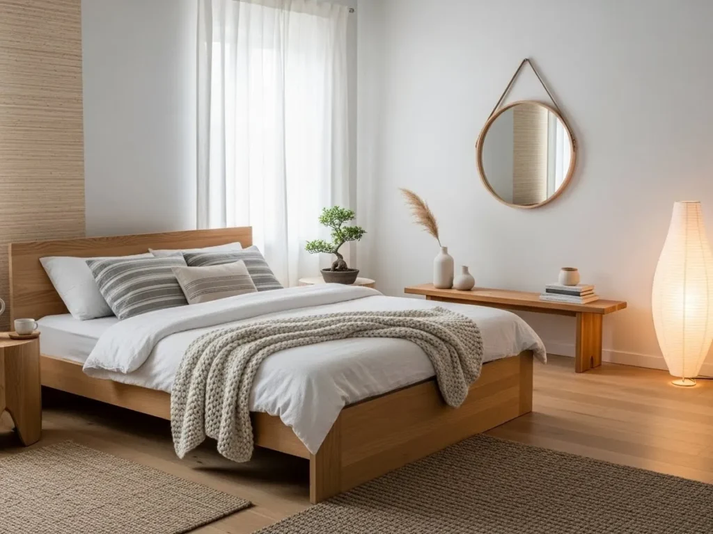 Subtle lighting enhances the tranquility of the space, often complemented by paper lanterns, soft LED strips, or warm bedside lamps. Wardrobes follow the same minimalistic approach, using sliding wood panels or simple built-ins to maintain a clutter-free look. Soft textiles—linen throws, cotton blankets, and woven rugs—add comfort without overwhelming the room. Japandi bedrooms create a calming, grounded retreat that blends functionality with aesthetic serenity.