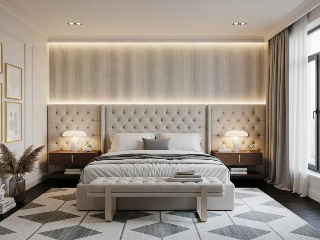 The wardrobe design in this trend typically remains sleek and discreet, allowing the headboard and accent wall to shine. Neutral palettes, warm lighting, and minimalistic décor balance the bold features, creating a harmonious atmosphere. Whether soft and romantic or sleek and modern, statement headboards help define the personality of the master bedroom. This style is perfect for those who want to blend comfort with dramatic elegance in a timeless, stylish way.