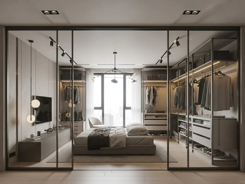 The bedroom surrounding a smart wardrobe typically embraces a sleek, modern aesthetic with minimal lines and advanced lighting. Soft neutrals and matte finishes help balance the high-tech features, creating harmony between innovation and comfort. With dedicated sections for accessories, shoes, and outfits, these wardrobes offer personalized organization. This idea is perfect for tech lovers or anyone wanting an effortlessly organized, futuristic master suite.