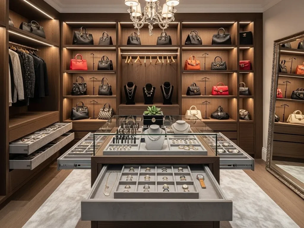 Boutique-style wardrobes are a major trend for 2026, transforming the closet into a high-end retail-inspired experience. Spotlight shelves illuminate handbags, shoes, and accessories like curated displays, making the space feel glamorous and organized. Velvet-lined drawers, glass jewelry cases, and pull-out trays add refinement while keeping essentials perfectly sorted. This type of wardrobe creates the feeling of stepping into a luxury boutique every morning, elevating the daily routine into something special and indulgent.