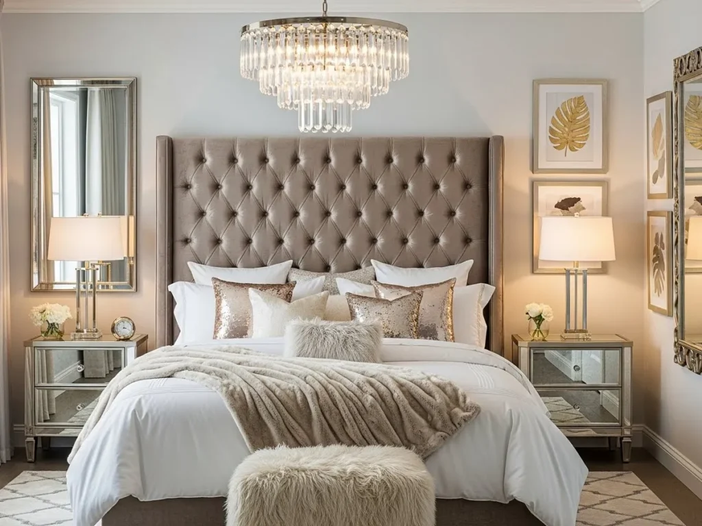 Modern glam bedrooms continue to shine in 2026, offering a perfect blend of sleek sophistication and luxurious details. Metallic accents—like gold, chrome, and champagne tones—add shimmer and visual interest without overpowering the space. Plush fabrics such as velvet, silk, and faux fur create a soft, elevated atmosphere that feels indulgent and stylish. The combination of glossy surfaces and warm lighting transforms the room into a glamorous retreat that’s both bold and elegantly refined.