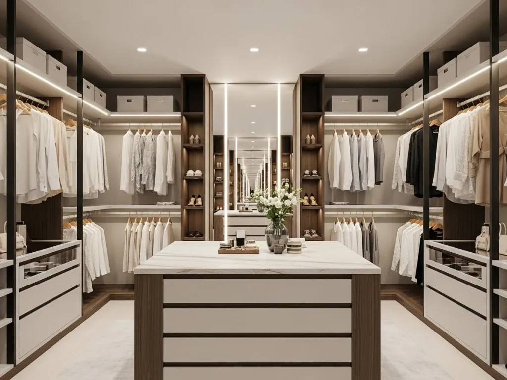 Warm LED lighting enhances the atmosphere, highlighting each item while maintaining a soft, inviting glow. Many homeowners mix wood, glass, and metal finishes for a balanced, contemporary look. Custom storage solutions ensure every piece has its place, making the space feel both functional and beautiful. When paired with a modern master bedroom, the boutique-style wardrobe adds sophistication and charm, ideal for those who value elegance and impeccable organization.