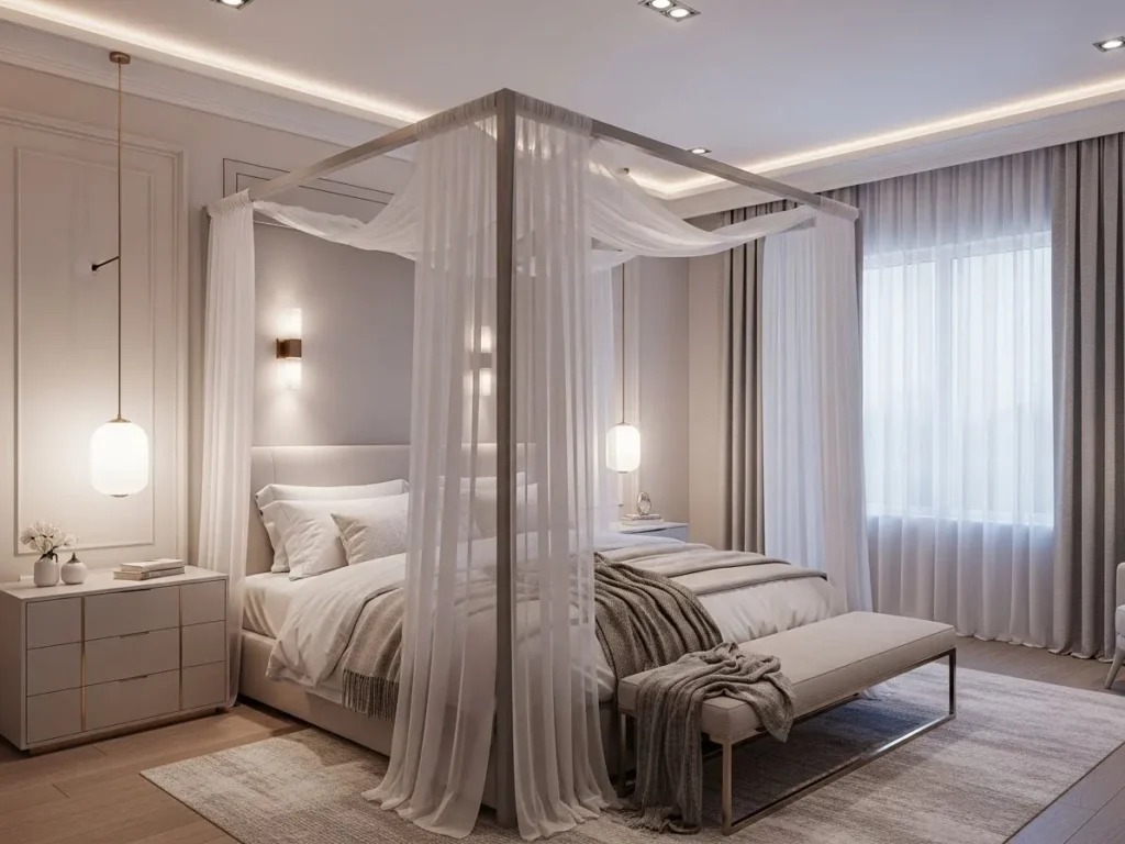 Canopy beds are making a lavish return in 2026 master bedroom designs, offering both elegance and a sense of enclosure. With slender frames, sheer drapes, and soft linens, modern canopy beds create a romantic and luxurious atmosphere without feeling heavy. This design choice instantly elevates the bedroom, turning the bed into the main statement piece. The canopy structure adds height and architectural interest, making the room feel grand yet intimate.