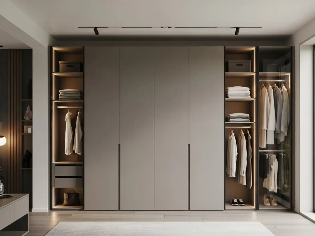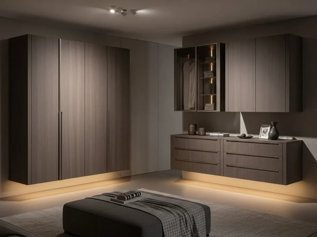 These wardrobes blend seamlessly with minimalist bedroom decor, offering streamlined storage without bulky frames. Neutral finishes like matte black, soft beige, or textured wood help maintain a balanced aesthetic. Inside, thoughtful storage options such as pull-out trays, divided drawers, and illuminated hanging spaces promote effortless organization. Floating wardrobe units are perfect for homeowners wanting a modern, eye-catching design that combines practicality with stylish architectural detail.