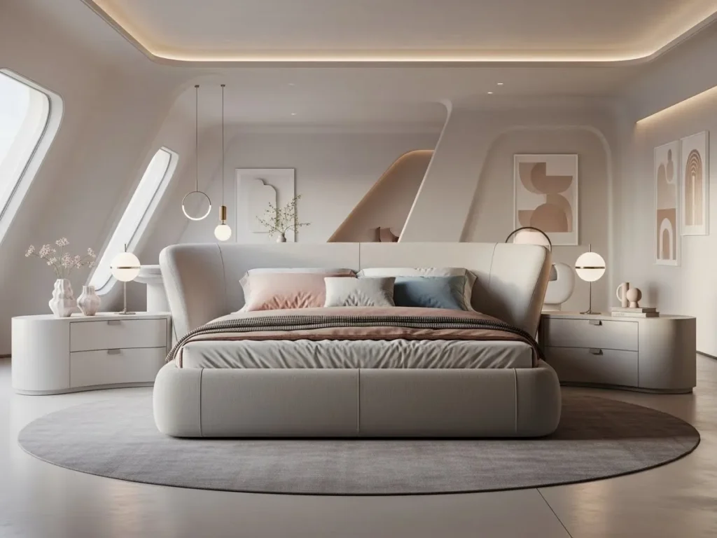 Wardrobes in this theme often feature curved edges or rounded sliding doors that echo the room’s soft aesthetic. Matte finishes, pastel accents, and warm lighting keep everything cohesive and harmonious. The seamless blend of curves and natural textures offers a relaxed yet refined atmosphere that feels fresh and contemporary. This trend is perfect for homeowners who want their master suite to look modern, elegant, and effortlessly soothing.